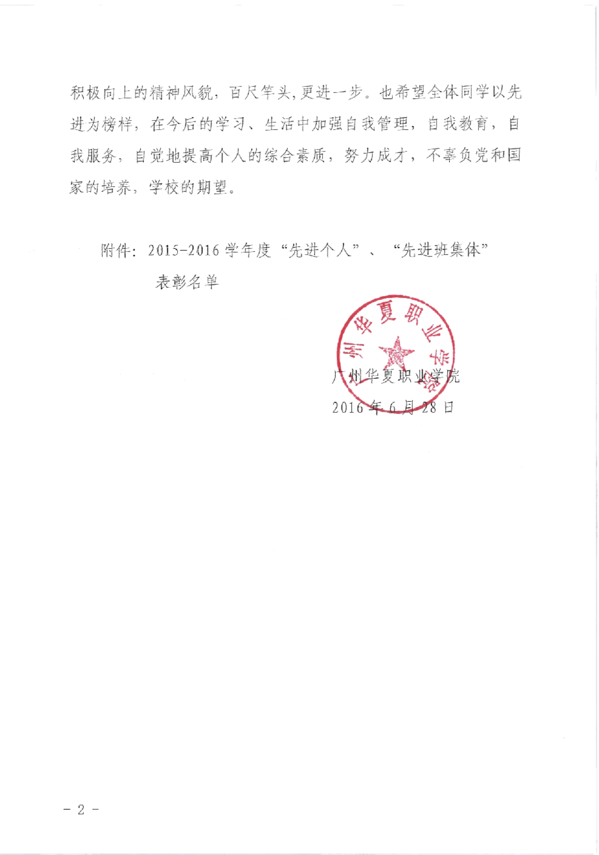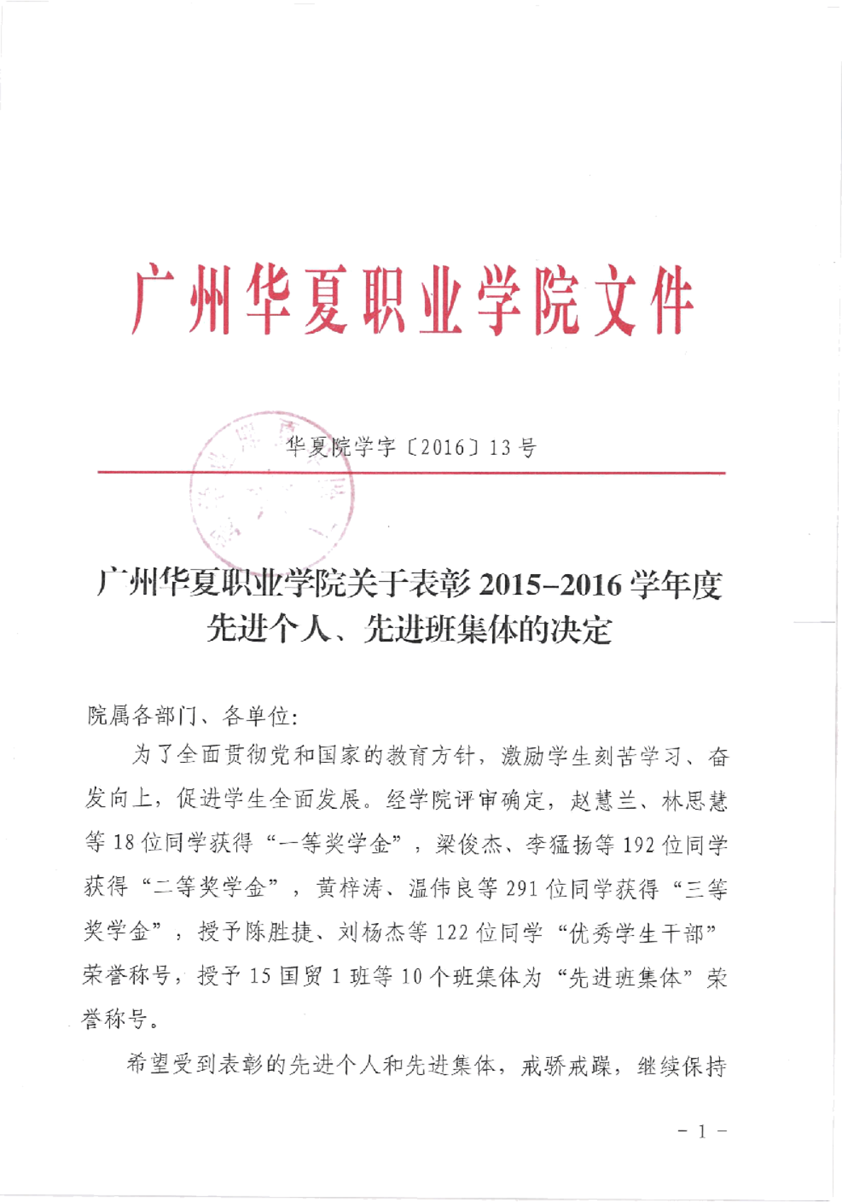 华夏院学字〔2016〕13号广州华夏职业学院表彰2015-2016学年度先进个人、先进班集体的决定
